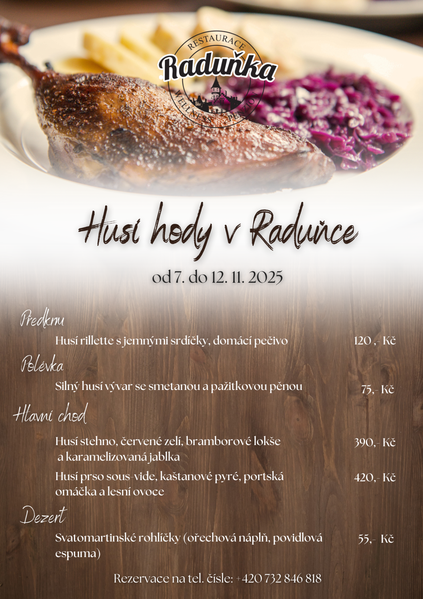 Podzimní tradice, poctivá kuchyně a vůně pečené husy – to jsou Husí hody v Raduňce. Přijďte si k nám užít svatomartinskou atmosféru s rodinou nebo přáteli a ochutnat speciality, které pro vás s láskou připravujeme.